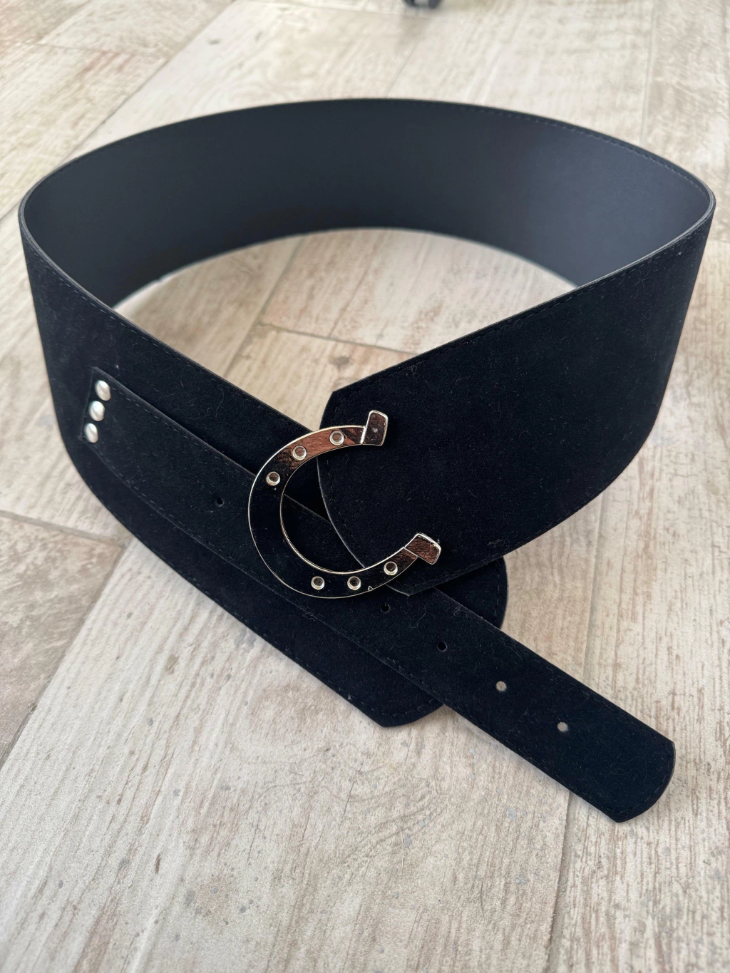 Cinturon faja gamuzada con hebilla bronce y plata.