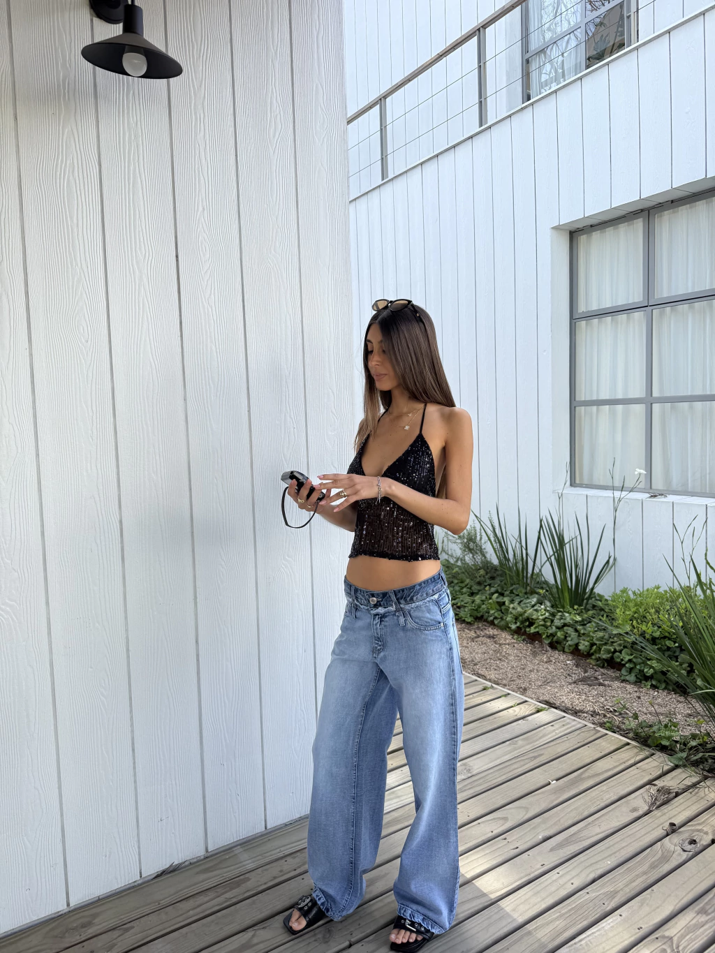 Denim tiro bajo con doble cintura en diferentes tonos de lavado azul. Calce wide leg, caída recta.